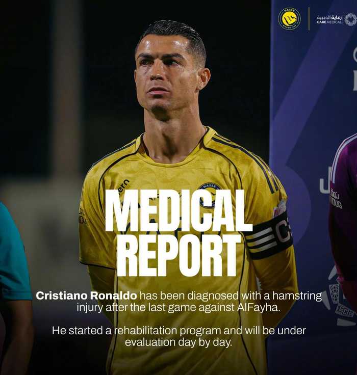 利雅得胜利公告:C罗在上一场对阵费哈的比赛后被诊断为腿筋受伤。他已开始康复计划,并将接受每日评估。